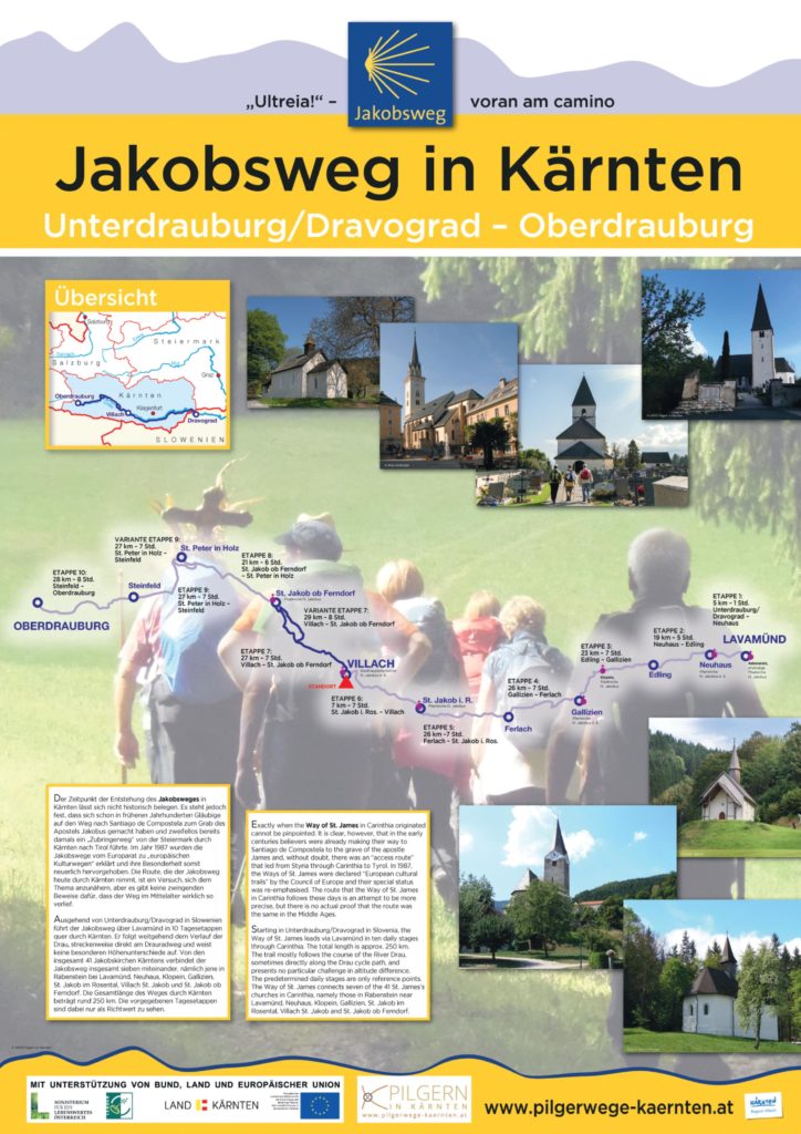 Seit Jahrhunderten übt der Jakobsweg eine faszinierende Anziehungskraft aus und verbindet die Menschen Europas in einem Netz an Wegen, die nach Santiago de Compostela in Spanien zum Grab des hl. Jakobus führen. Wer diesen Weg betreten möchte, muss nicht weit in die Ferne reisen. Wenige Schritte genügen, um den Fuß auf den Jakobsweg in Kärnten setzen zu können. Von Slowenien und der Steiermark her kommend nimmt er bei Lavamünd in Kärnten seinen Anfang und folgt dem Drautal bis nach Oberdrauburg, wo er an der Grenze zu Osttirol seine Fortsetzung am Tiroler Jakobsweg erfährt. Ein Weg, der sich eingliedert in das große Netz der Jakobswege, die nicht nur die Füße, sondern die ganze Fülle unserer Lebenswege tragen.