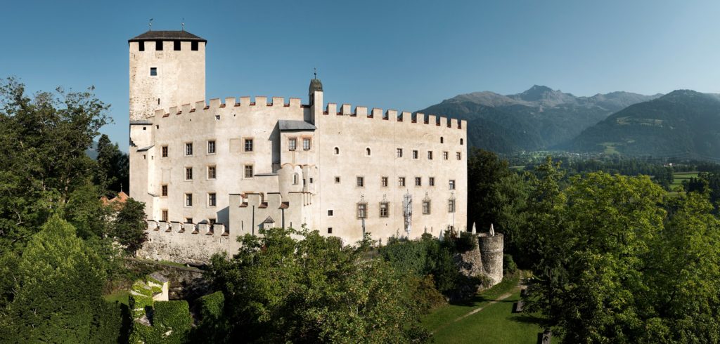 Schloss Bruck with its castellated walls and stunning castle keep sits elevated on the crest of a hill in the middle of a well-tended mixed woodland area. The castle was built between 1252 and 1277 as a residence for the Counts of Gorizia and is named after a bridge that runs beneath the Schlossberg across the River Isel.